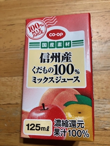 さて、このごろ好きな果汁ひとつめは、「信州産くだもの100㌫ミックスジュース」。