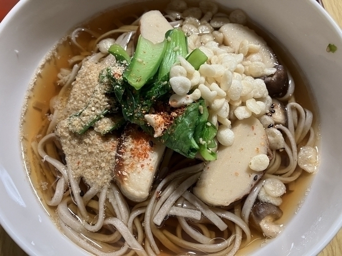 温かい蕎麦でもうどんでも、この時期は、丼に盛ったあとに胡麻油を一振りするので。もともと蕎麦の器の中には油分が含まれている。そこに揚げ玉を浮かすと、さらに汁に浮く油は増えるけれども、揚げ玉はほとんど箸に掛からないので、蕎麦やほかの具を食べてしまったあと、汁の中にだいたいの揚げ玉は浮かんで残っている。関西の揚げ玉(天かす)には、お好み焼きやたこ焼きといった「粉もん」のタネを構成する要素のひとつとして、地味ながらタネにコクを供給する大きな役割があるけれど、トップバリュのふつうの「天かす」なら、それだけ食べてもとくにサクサクした感じは乏しい。だから、温かい蕎麦の汁に残った揚げ玉は、蕎麦にコクを与えたあとのもので、現在では汁ごとすべて食べてしまったりはしないんじゃないでしょうか。まして、冷やし蕎麦の汁に残った揚げ玉は、という感じです。これがもし小エビ入りのハイクラス揚げ玉だったりしたなら、冷たい蕎麦と一緒に真っ先に掻き込んでいたりするのかな。